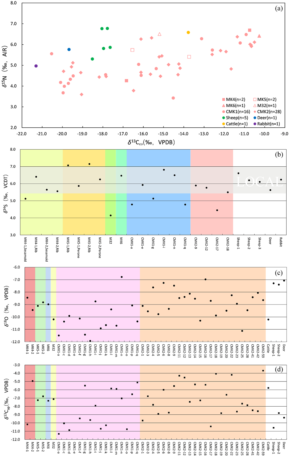 图2 马匹δ13C、δ15N、δ34S、δ18O值散点图