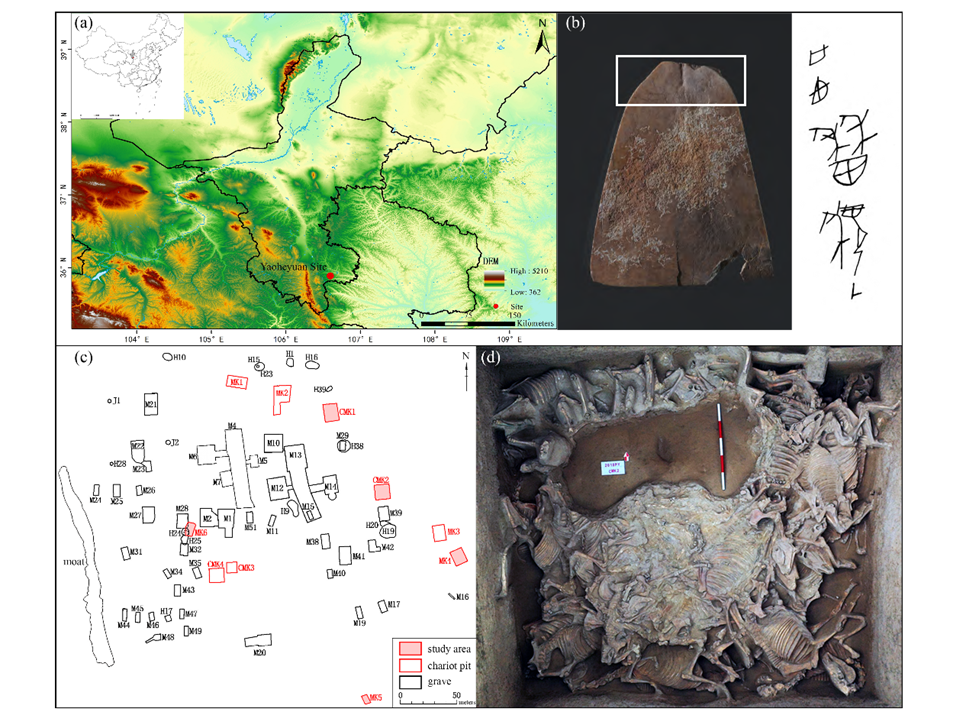 图1 姚河塬遗址考古信息图:姚河塬遗址地理位置图(a);卜骨(b);高等级墓葬区平面图(c);CMK2照片(d)