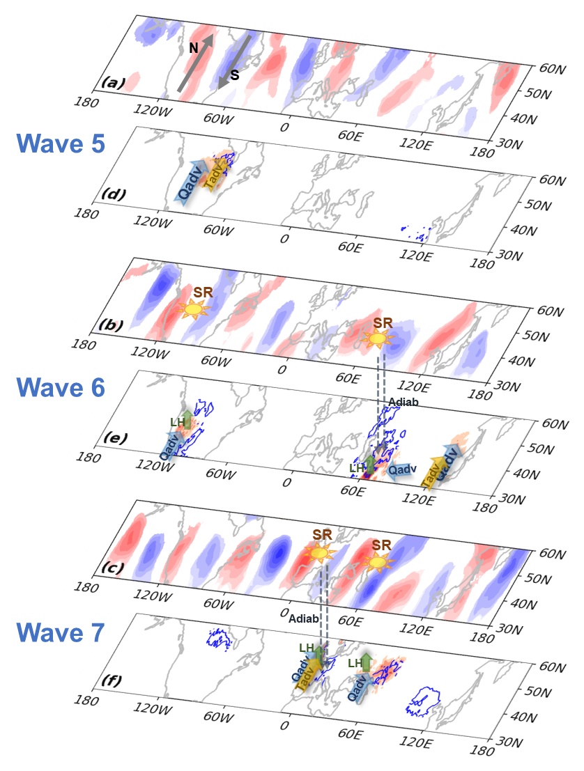 图题:夏季高振幅准定常波的经向风异常场(米/秒):(a)5波、(b)6波、(c)7波;与夏季高振幅准定常波相关的湿热浪最长持续天数的异常场(填色)和高温热浪最长持续天数的异常场(等值线)以及相关的动力学、热力学过程:(d)5波、(e)6波、(f)7波。