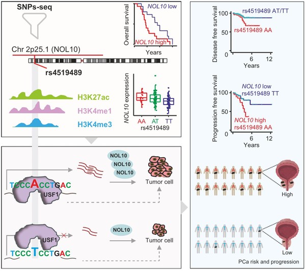 综上,本研究创新性地揭示了前列腺癌的遗传易感性机制,并将“rs4519489–USF1–NOL10“ 调控轴确立为一个极具潜力的生物标志物与治疗靶点,为推进前列腺癌的精准诊疗开辟了新路径(见图1)。