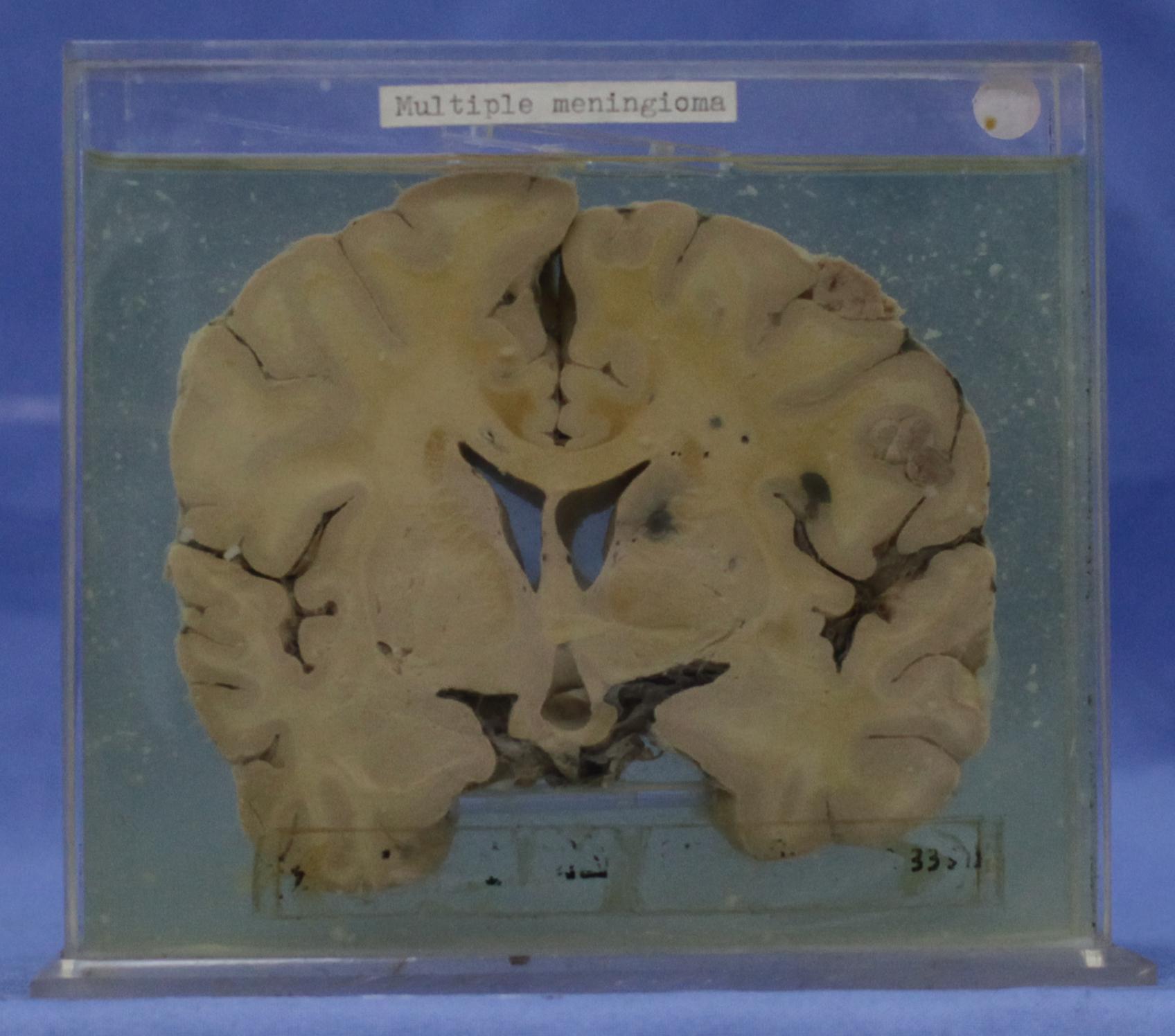 大脑冠切,左侧颞叶见8*7cm大致呈三角形灰红肿块一枚。