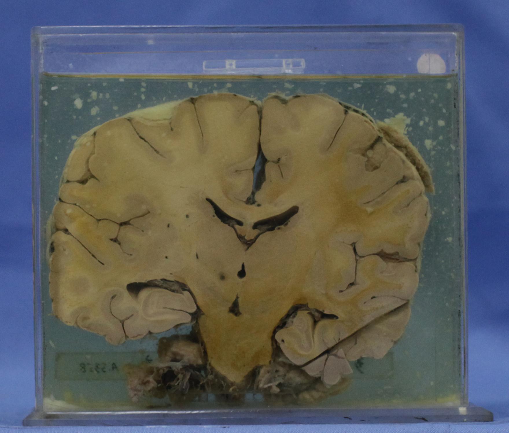大脑经中脑、小脑水平冠切,其左侧顶叶上份可见3*3cm三角形灰红肿瘤组织一枚,与脑组织分界明显。