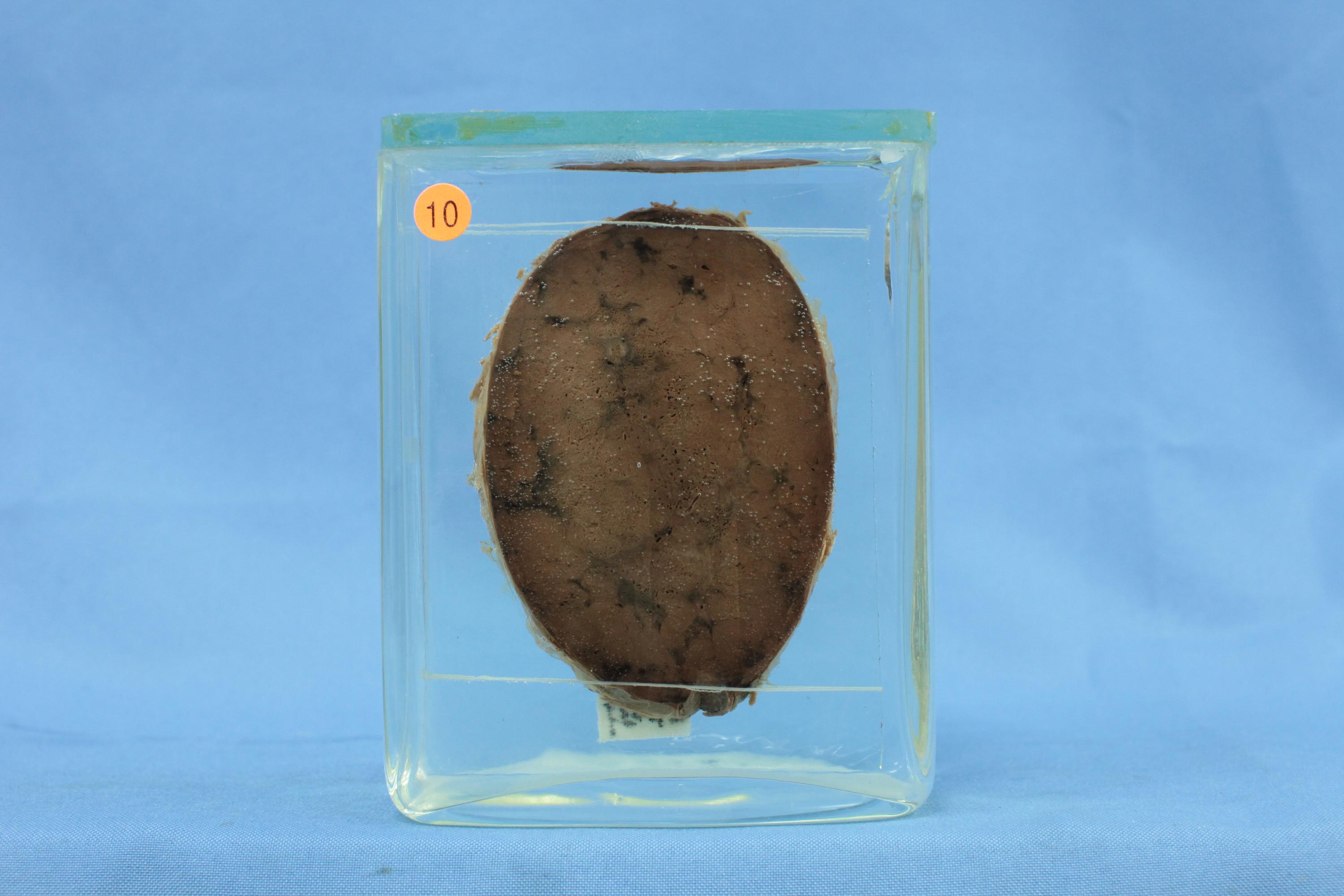 患者女,27岁,标本为肾上腺组织,见一卵圆形结节,直径约12cm,边界清楚,有完整包膜,切面呈灰红色,散在分布着点状出血灶。