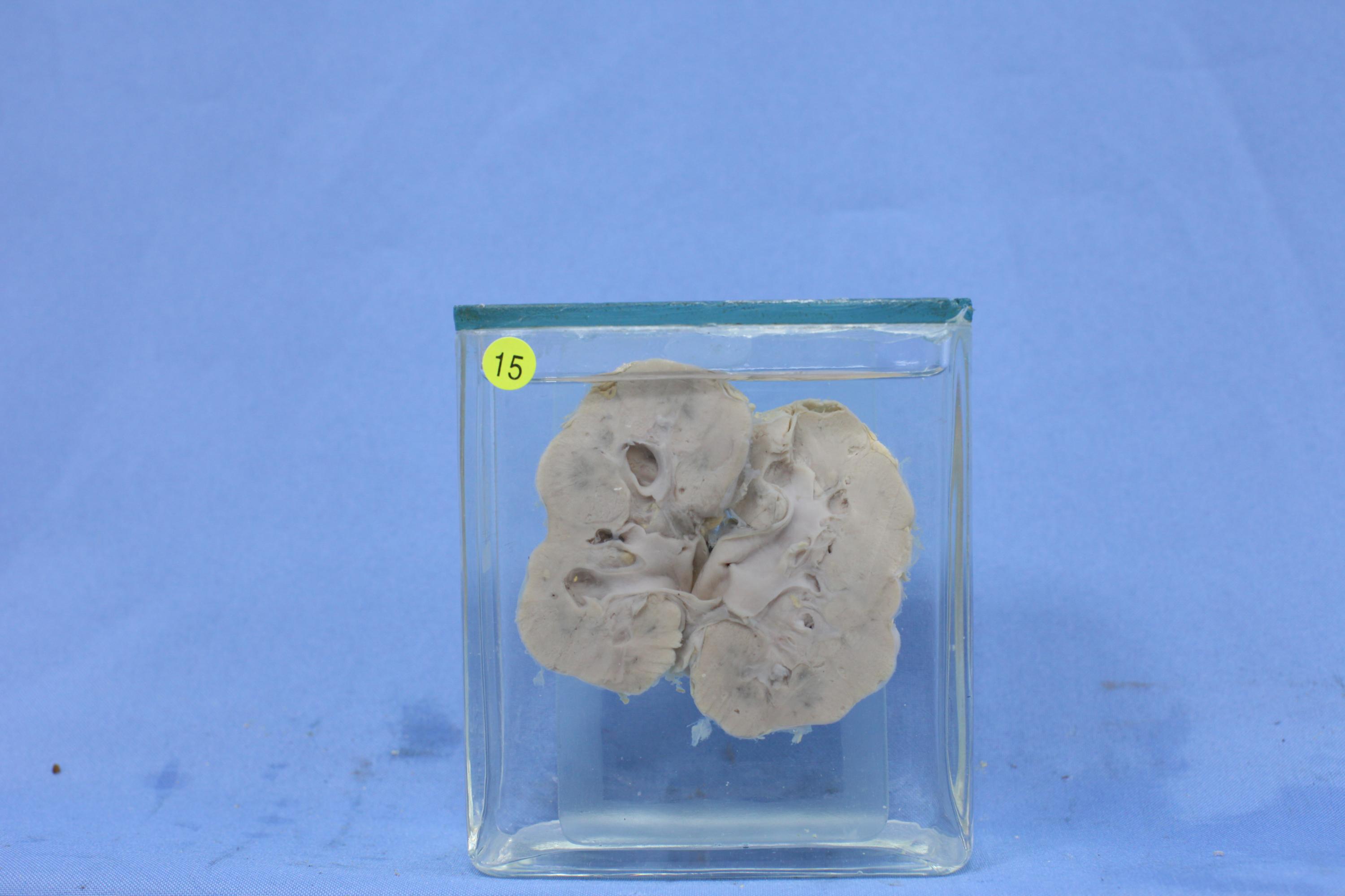 肾脏,外形不规则,见较多切迹。切面皮质明显变薄,局部皮质消失,皮髓分界不清。 尸体为出生4天女婴,食管狭窄,食管气管瘘,肾脏发育不全。 *