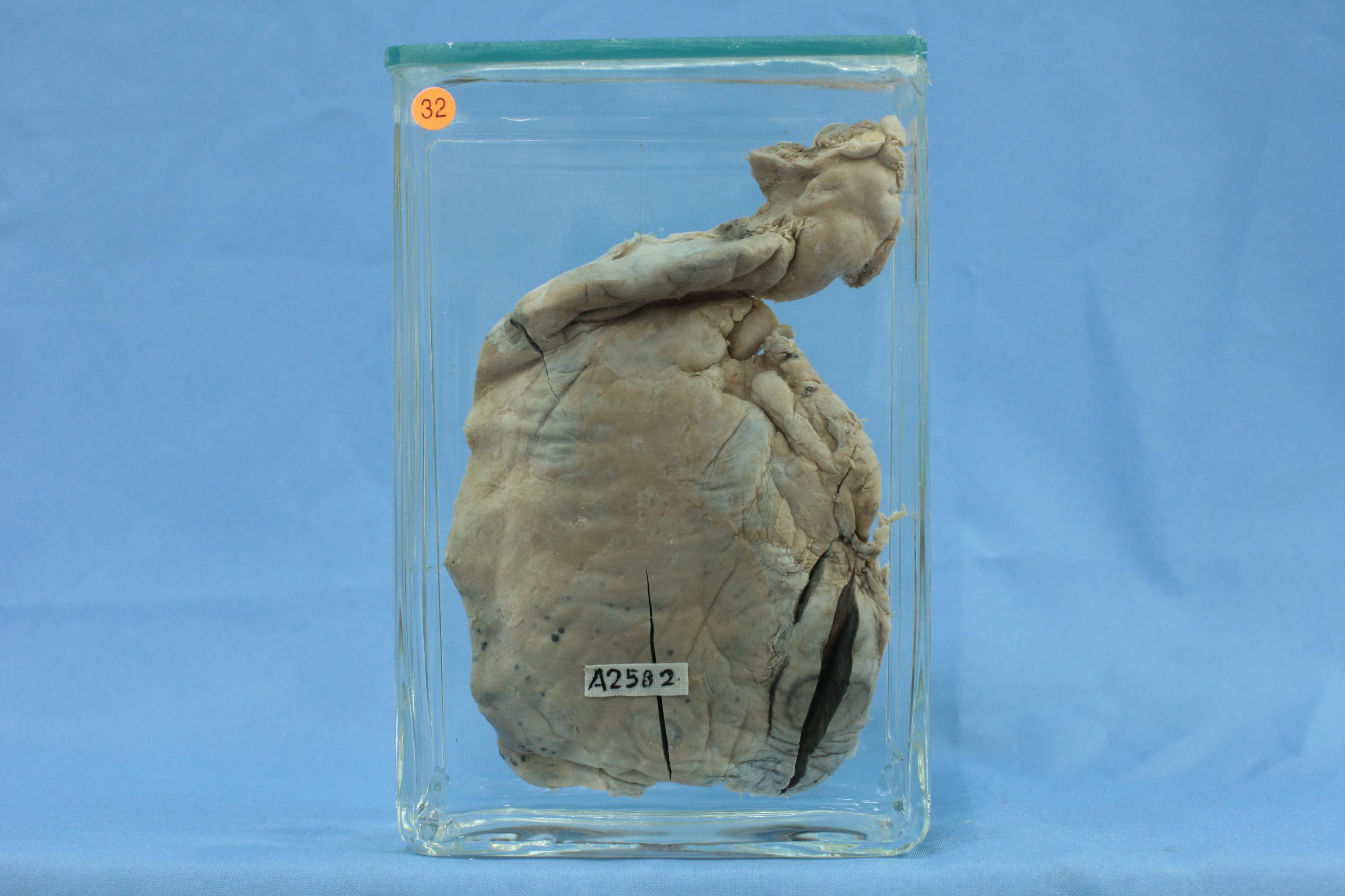 胸膜脏、壁层广泛纤维性粘连,表面可见肋间脂肪组织。切面肺近胸膜一侧有一5×1.5×1.5cm暗红色病灶,界较清,累及胸膜。