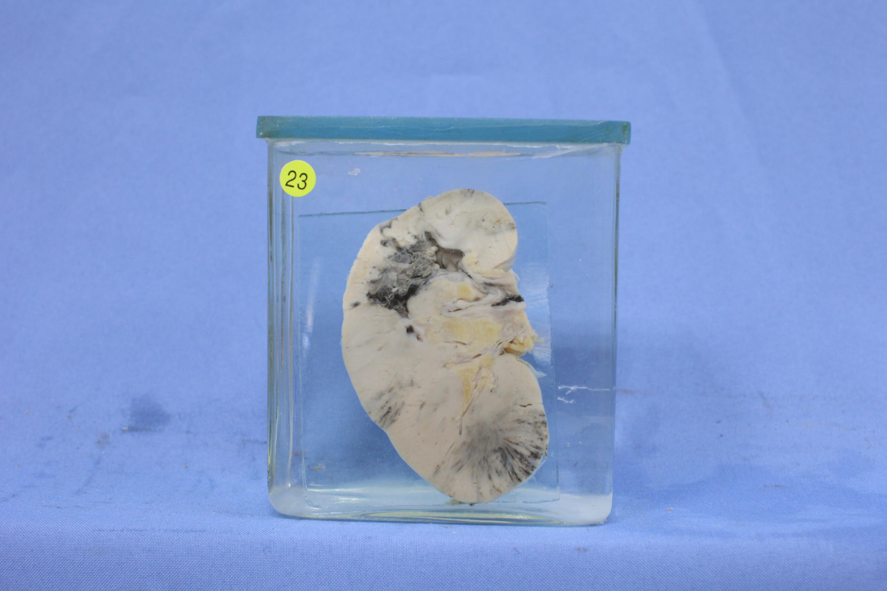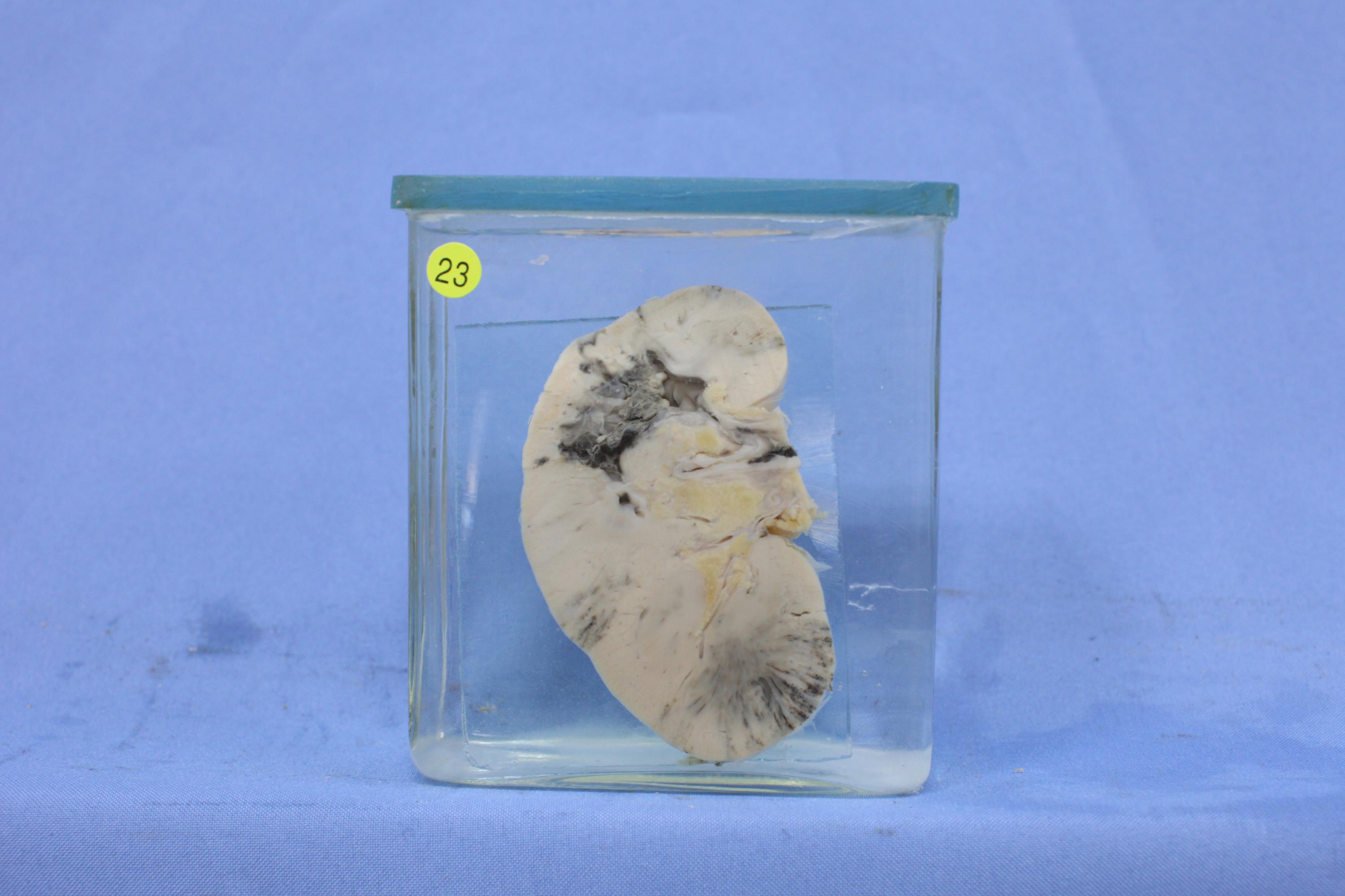 肾脏体积明显缩小、质硬、苍白,肾盂黏膜粗糙、暗红、充血,结构不清。切面皮髓交界不清,瘢痕形成,肾盂腔内积血。肾包膜见多量粟粒大小出血灶。