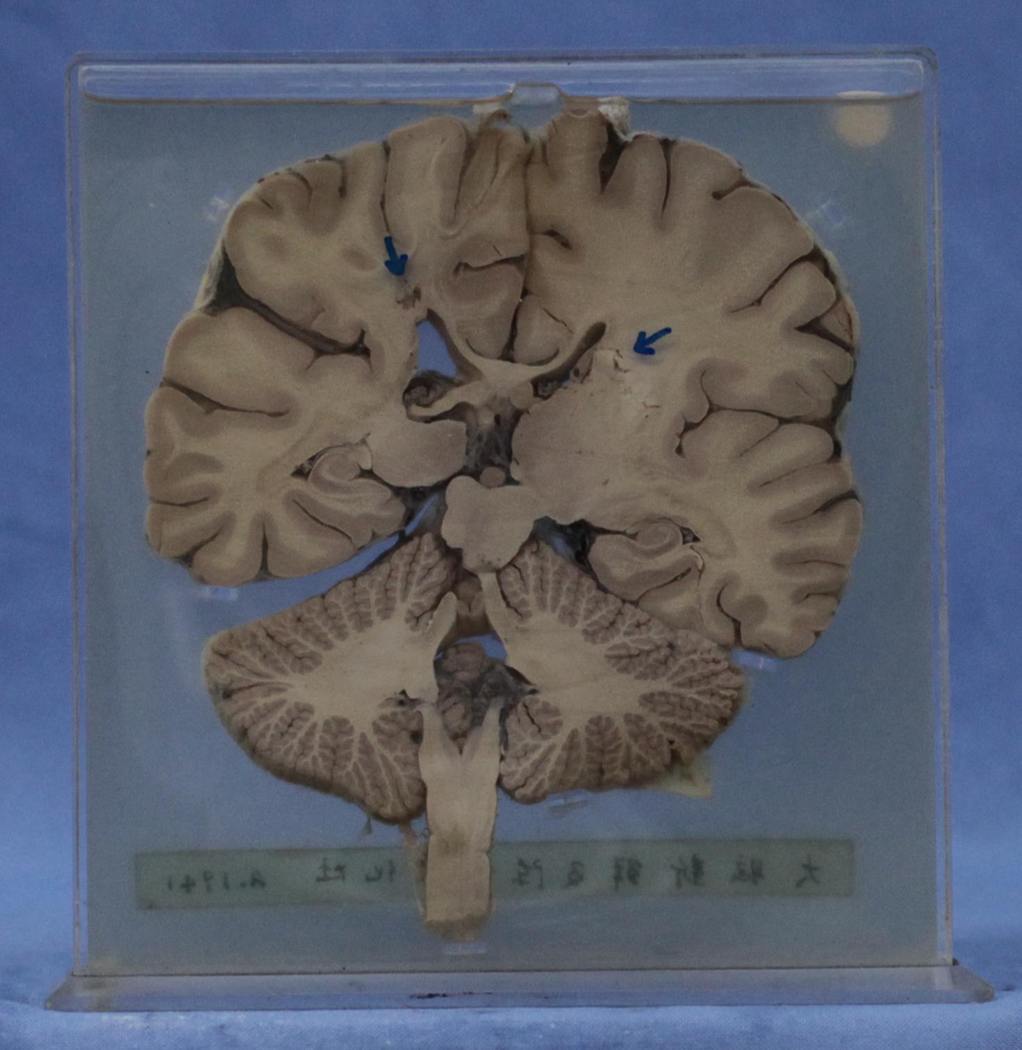 大脑半球、小脑及延髓冠状切面,在双侧基底节与胼胝体相连部位分别见一直径0.5cm液化坏死灶(左),0.5-0.8cm(右)液化坏死灶。