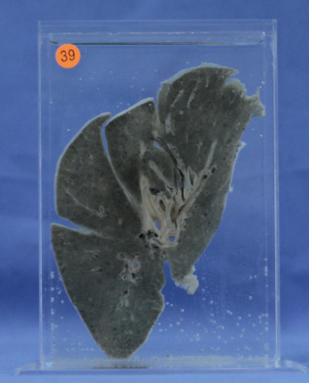 切面肺组织中均可见散在分布的灰白色细小颗粒,其直径多小于1mm,周围肺组织轻度充血。