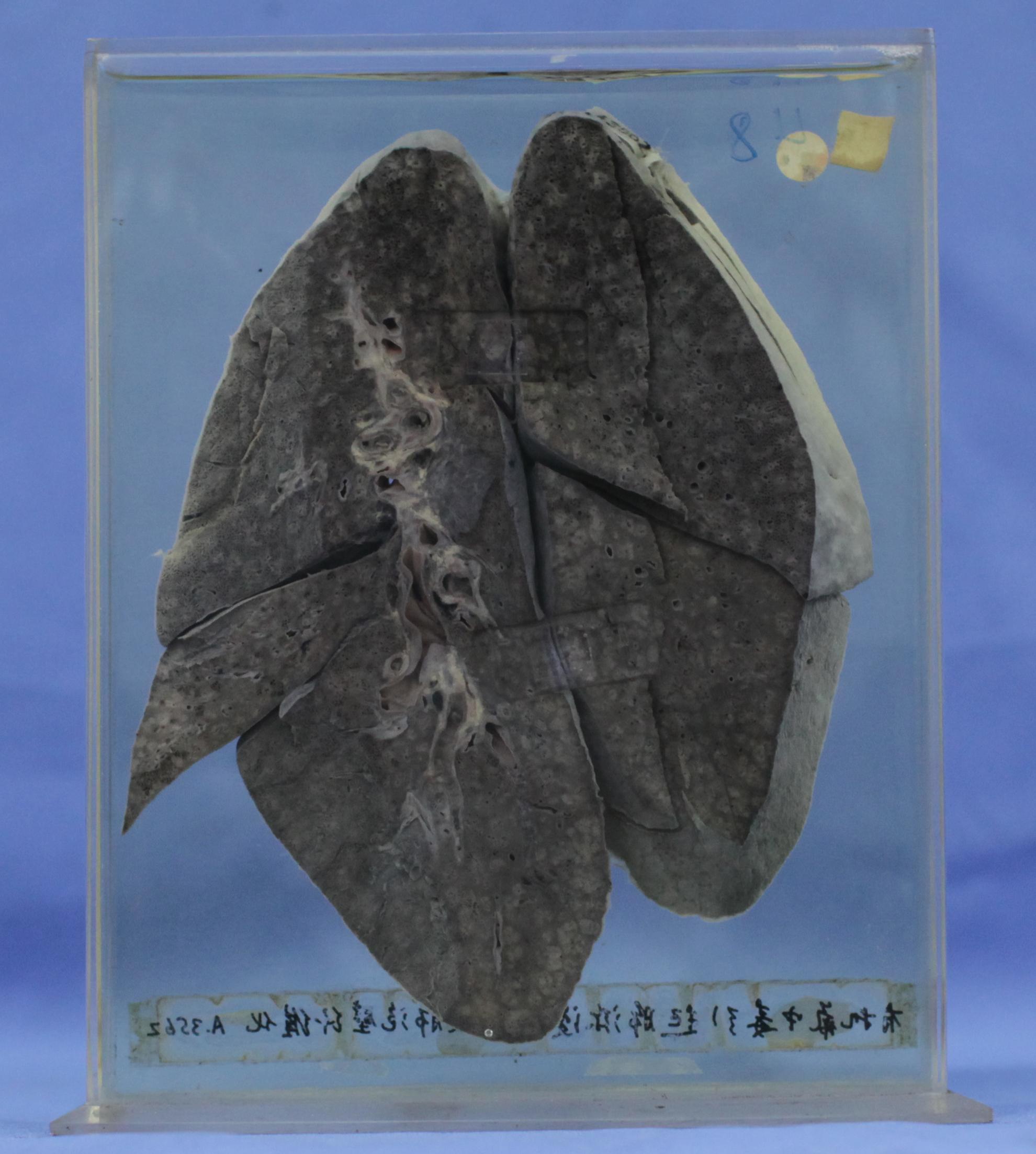 有机氟中毒早期主要表现为肺淤血、水肿,并可伴有化学性肺炎,肺泡上皮破坏。以后渗出物机化、肺泡上皮和间质纤维组织增生,而到肺弥漫性纤维化。本例肺组织肉眼主要呈散在不规则实化灶,似小叶性肺炎。背景肺组织暗红色(淤血),并见肺泡间隔增宽,纤维组织增生,尤以小支气管周围为著。