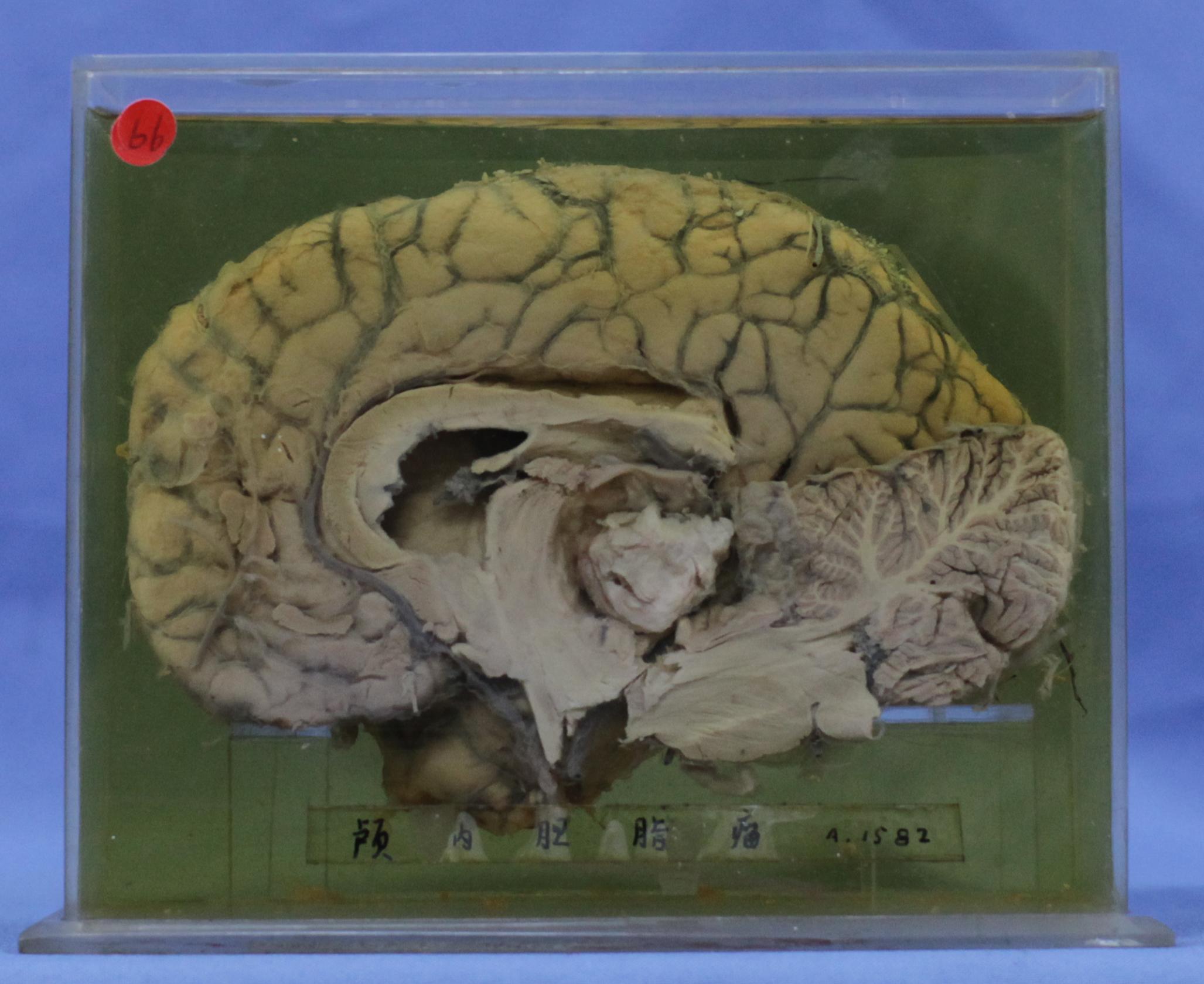 大脑矢状切面,见脑干后上部有一2×2cm三角形,白色占位,推挤,压迫周围组织,切片证实为胆(固醇)脂瘤。