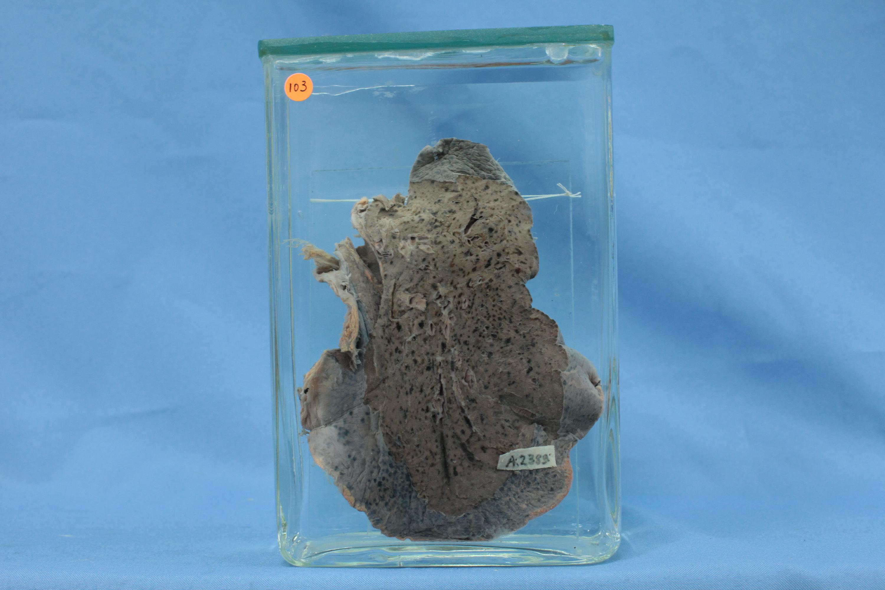 肺叶体积略为缩小,质地较实。切面肺组织呈棕色,肺泡气腔不明显,并可见散在黑色和棕色颗粒。
