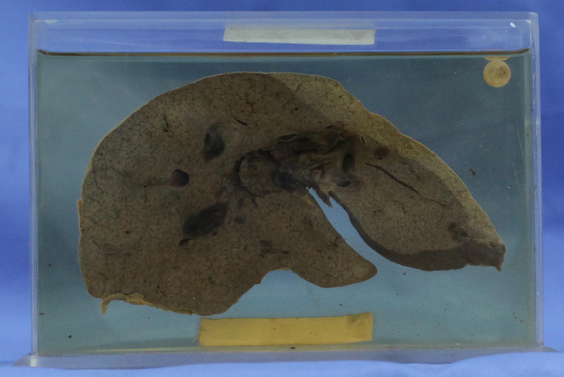 肝的冠状切面,表面光滑,包膜紧张,肝体积较肿大。切面可见均匀而弥漫分布的紫红色小点(肝小叶的中央区),它的周围呈灰黄色(小叶的边缘区),部分区域的紫红色小点相互融合,形成红黄相间的条索状结构,极似槟榔(一种中药材)的切面,故称肝淤血为槟榔肝。肝静脉扩张,有血块形成。