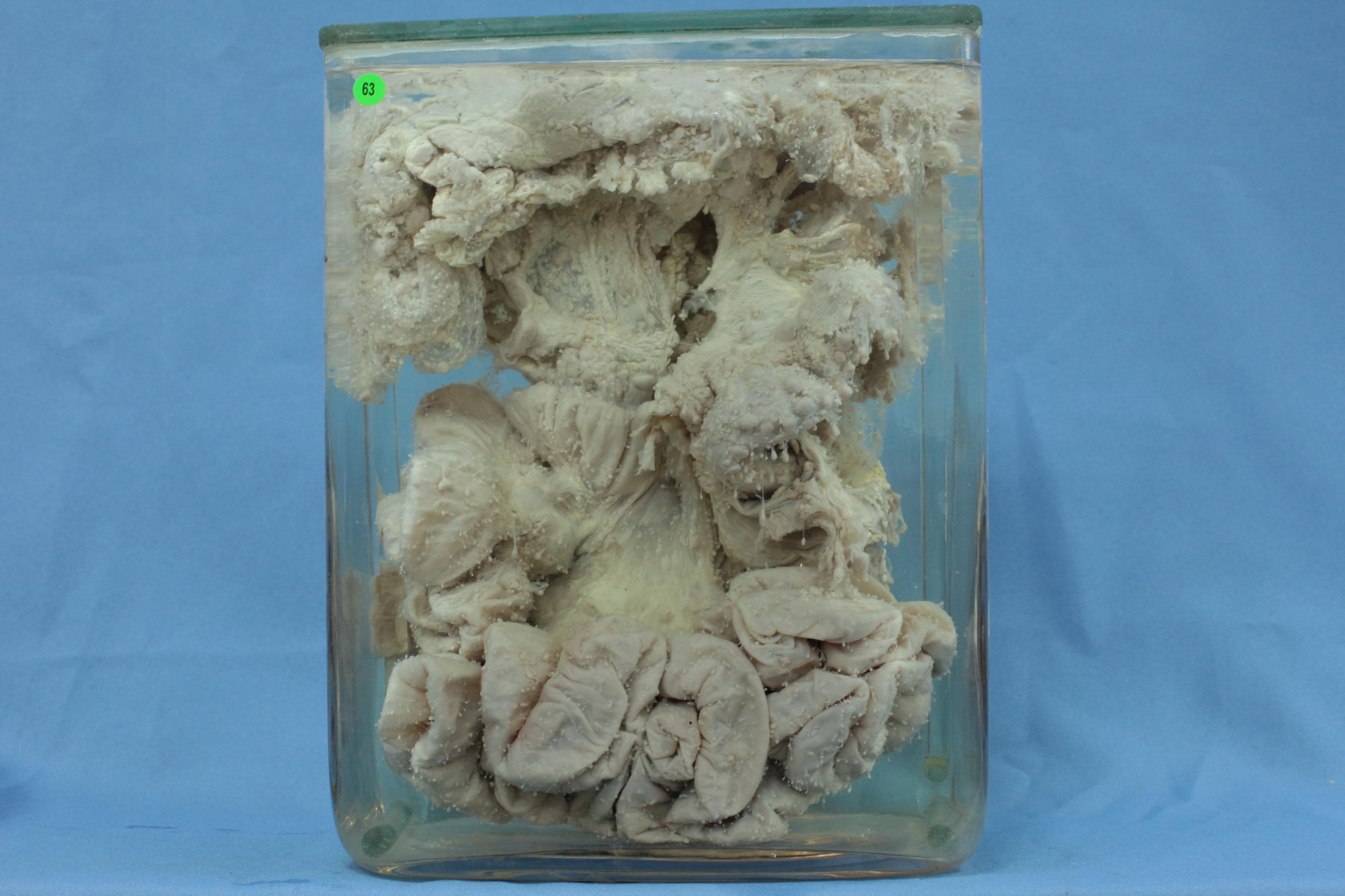 肠系膜及部分粘连的小肠组织,肠系膜表面见大量粟米大小的细节细节及少数大小不一的圆形肿大淋巴结结节,呈散在分布。同时肠道浆膜面也有大量粟粒样结节分布。