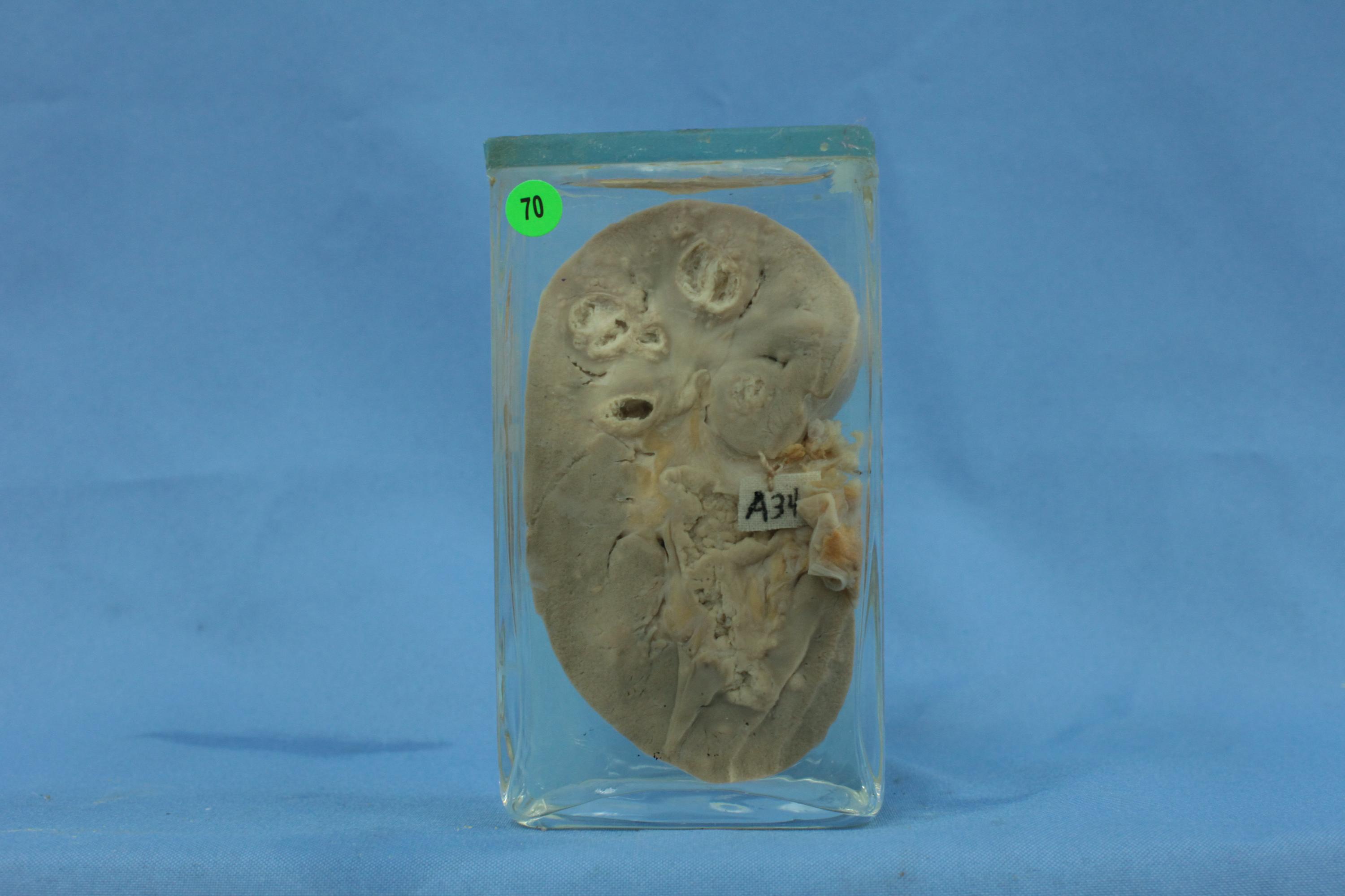 一侧肾脏,体积肿大,切面见上端肾实质内有多个圆形干酪样坏死灶,中央部分坏死物质液化破溃入肾盏、肾盂,形成多个空洞。下端肾组织尚存,皮髓质交界不清。