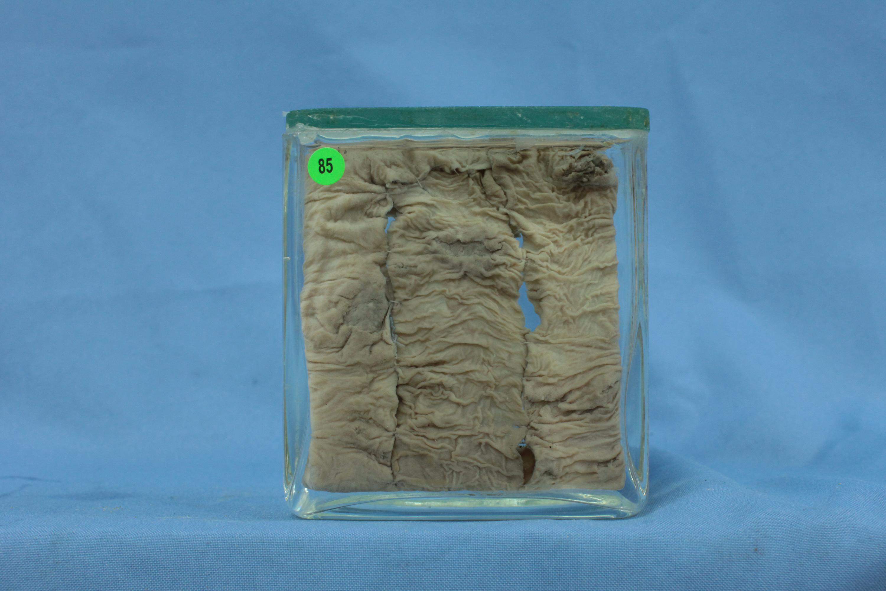 回肠三段,平行垂直排列,左两条中部及右侧一条的上部黏膜面均见有一个溃疡,呈横行椭圆形或扁椭圆形,以中间一条肠道溃疡最典型,其长轴与肠的长轴垂直。溃疡边缘不整齐如鼠咬状,溃疡底部可深达肌层或浆膜层,其相对的浆膜面有纤维蛋白渗出和粟粒结节形成。