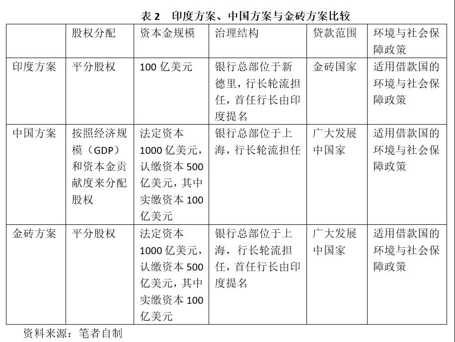 在谈判中,印度提出的制度方案是建立由金砖五国共同领导的拥有100亿美元资本金的新型南南合作银行,五国平分股权。中国并没有直接拒绝印度的制度方案,但是最初的反馈效应是模棱两可。针对印度提出的五国平分股权的倡议,一些中国的金融专家和政策人士在金砖智库会议上表达了不同意见,提出平分股权可能会对金砖银行的运作效率造成负面影响。中国财政部亚太财经与发展中心主任周强武表示,“五个国家各占20%股权的做法,会导致金砖银行存在先天性效率不足的问题,如果管理不好,这一做法会让机构决策变得困难”。上海高级金融学院的朱宁指出,“如果五个成员国在金砖银行中享有平等的股权,金砖银行内部将会存在严重的协调问题,运作效率会受到影响”。中国银监会的徐庆宏也指出,“从其他多边开发银行的历史来看,金砖银行平分股权的倡议需要慎重考虑。金砖银行如果采取平分股权的制度安排,那将意味着在运作中需要不断地进行谈判,需要同时满足五个新兴大国的政治诉求。而金砖国家本身差异很大,很多非经济的因素将会给银行带来巨大挑战,因而金砖银行的可行性研究可能需要更长时间”。