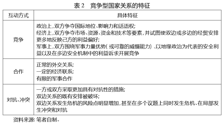 竞争既是国家间的主要互动方式之一,又是国家间关系的一种基本形态。当竞争 成为国家间主导性的互动方式时,国家间关系就呈现为竞争型关系,它不同于国家间 的合作型关系和敌对型关系( 见表 1) 。一般来说,竞争型的国家关系主要表现如下 ( 见表 2) :政治上,双方争夺国际地位、影响力和话语权,并试图影响对方的国内政治 进程,使其朝着于己有利的方向发展。经济上,双方争夺市场、资源、资金和技术等要 素,谋求经济交往中更多的绝对或相对收益,并试图使双边或多边经贸安排更多地反 映己方利益偏好。军事上,双方围绕军事力量优势( 或可靠的威慑能力) ,以地缘政治 为代表的安全利益和在多边安全机制中的利益诉求开展竞争,双方都在军事上为发生 冲突做准备,但又都希望避免严重冲突。竞争型关系并不排除合作与交流。有学者对 国家间竞争型关系中存在的合作与交流做出以下描述: 在军事领域,国家间互动频 率不高、多样性不足,可能在联合搜救等军事演习、联合国维和行动、非核心军事情报 资源共享和低层次军事技术与产品的交流等方面存在有限合作。在政治领域,国家间 建立了正常的外交关系,各层次、多议题的政治性交流比较频繁,在多边框架内的接触 也比较多。在经济领域,国家间维持一定数量的金融和商品贸易额。此外,竞争型关 系也在一定程度上含有对抗和冲突的内容: 竞争双方利益上的冲突性增强; 一方或双 方采取更加具有对抗性的措施; 双边关系的既有安排被破坏,如“威胁冻结合作或退 出合作,不再遵守已有的协议和框架” ;双边关系发生危机的风险点明显增加,甚至在 多个议题上同时发生危机、在局部发生冲突和对抗。