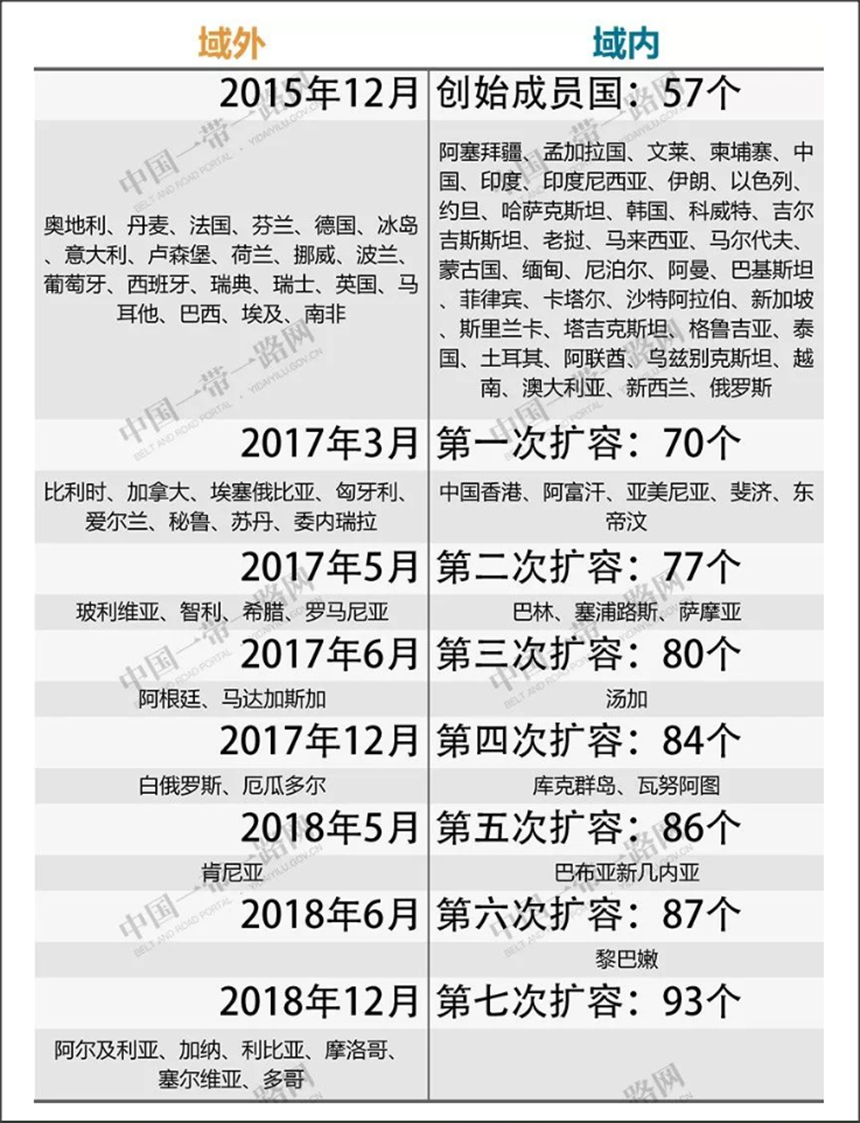 19日公布的新一批被批准的6个意向成员分别是阿尔及利亚、加纳、利比亚、摩洛哥、塞尔维亚和多哥。亚投行的成员数量从57个创始国上升到93个,遍布各大洲。很多非洲国家也正考虑申请加入,亚投行行长金立群认为,这表明亚投行不仅促进亚洲的经济发展,也推动了亚洲和其他地区的共赢互利合作。