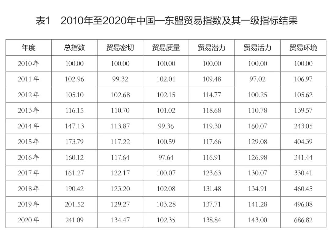 2010年中国—东盟自由贸易区正式全面建成。随着我国与东盟国家的贸易往来日益紧密, 双边货物贸易额由2010年的2934.3亿美元增长至2020年的6852.5亿美元,东盟已跃升为中国第一大贸易伙伴。为客观反映我国与东盟国家贸易发展状况,在海关总署统计分析司的授权和指导下,南宁海关联合广西大学中国—东盟信息港大数据研究院组成课题组,共同编制中国—东盟贸易指数,并于2021年9月将指数报告在第18届中国—东盟博览会和中国—东盟商务与投资峰会上首次正式发布。