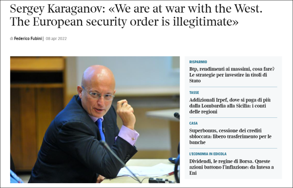 卡拉加诺夫:在我们看来,大多数(西方)机构都是片面和非法的。他们正在威胁俄罗斯和东欧。我们想要公平的和平,但美国人的贪婪和愚蠢以及欧洲人的短视表明他们不想要这样。我们必须纠正他们的错误。