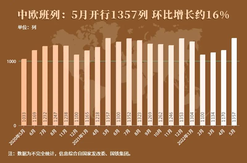 5月份,中欧班列开行1357列,比4月份增加187列,环比增长约16%,增速进一步扩大,已恢复至2021年同期水平。1—5月,中欧班列开行6157列,同比增长3%,综合重箱率达97.7%,呈现“稳中有进”的良好发展态势。