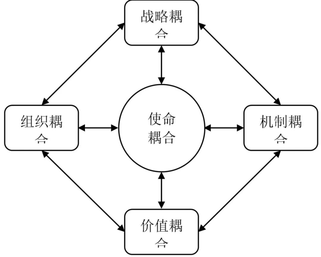 耦合型政企关系作为一种新范式,有其内在的构成要素和运行机理,同时遵循一般系统运行的规律与逻辑。耦合型政企关系的构成要素可以概括为“五大耦合”,包括使命耦合、战略耦合、组织耦合、机制耦合以及价值耦合,如图1所示。“五大耦合”之间紧密联系、交互作用,使命耦合是新范式成立最重要的前提和基础,战略耦合决定新范式运行的目标和方向,组织耦合与机制耦合确保新范式的落地实施,价值耦合体现新范式的运行成效。