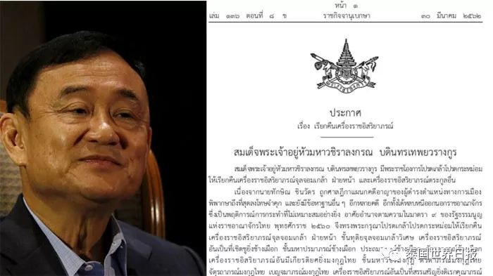 据新华社消息:泰国政府宪报网站30日公布国王玛哈·哇集拉隆功的公告,称因前总理他信逃案的行为非常不合适,撤销所有授予他的勋章和奖章。
