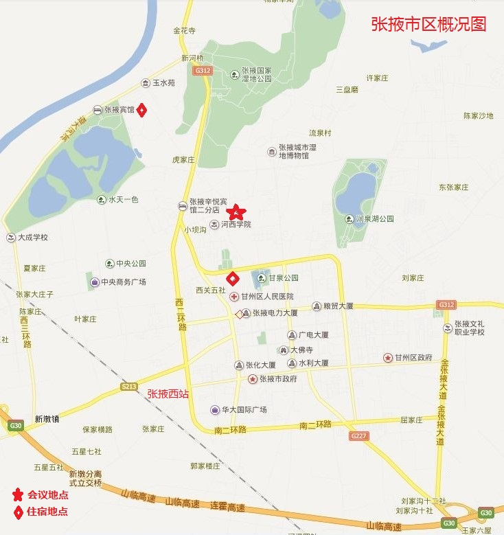 (三)张掖市区简图(张掖宾馆到河西学院大约3-4km,小辣椒酒店约500-1000M)