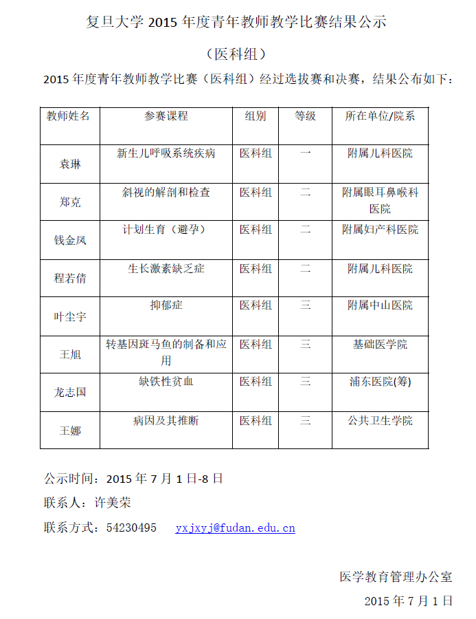2015年度青年教师教学比赛(医科组)结果公示