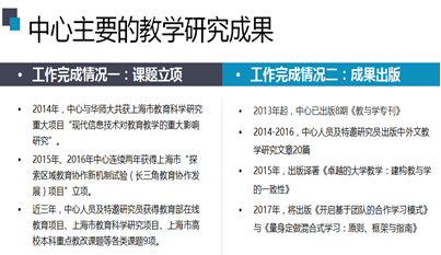 开幕式上,中心常务副主任王颖首先回顾了中心成立以来开展的教学研究工作,然后着重介绍了特邀研究员制度,以及首批特邀研究员们围绕学校重点教育教学工作所开展的创新教学模式、本科生学情和在线学习的大数据等三大类研究情况。