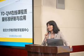 在随后的大会报告阶段,美国QM在线课程质量评估机构执行主席Deb Adair和高级学术总监高亚萍、Teledo大学在线教学课程设计与开发部副主任肖名丽、沙特阿拉伯阿卜杜拉曼宾费萨尔大学远程教育学院院长Bandar Al-Amer等发言者分别就“教师在开发和实施优质在线教学过程中的作用与学生成就”“卓越之路:通过专业化认证和教师发展确保在线教学的质量”和“QM在推动大学强化在线学习部署中的作用”作了主题报告。接着,中心副主任丁妍总体介绍了复旦开发FD-QM在线课程质量标准的理念、思路和实施路径。