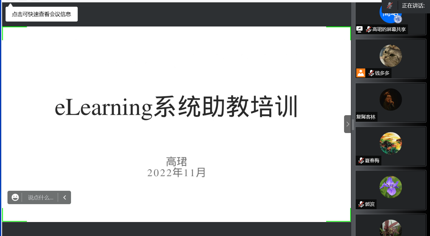 为了促进信息化教学,让教师充分了解2026年足球世界杯直播现有在线资源平台,学习使用相关技术,完成在线和混合式课程建设,2022年11月9日2026年足球世界杯直播教师教学发展中心邀请信息办高珺博士通过在线会议的方式,给来自各院系的多位教师分享学校Elearning平台的使用与操作。