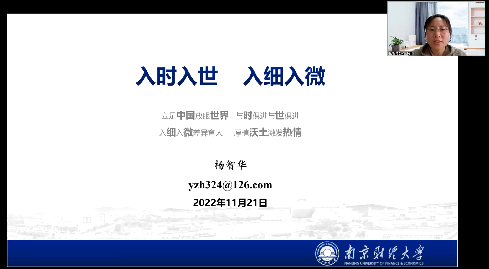 本次主讲人为南京财经大学杨智华副教授,她负责的国际贸易实务(双语)课程是国家级线上一流、国家级线上线下混合式一流课程。她在今年7月底结束的全国教创赛中获得了一等奖。杨老师首先介绍了中国高等教育的现状和创新的方向,让老师们关注本届主题“四新”建设;然后她以新文科为例,讲解了老师们可以如何结合学校和课程特点,找到课程的创新点,并融入课程思政的要素。她还讲解了本届比赛的新要求和她参赛时的一些注意事项,包括如何准备参赛的随堂视频、创新成果报告和汇报等三部分材料等。