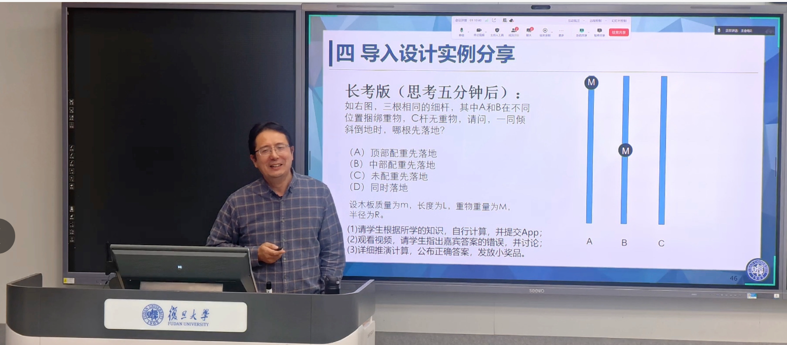 而后,倪老师结合他所授“大学物理”中的教学导入案例逐个阐述这些要诀:案例包括从“神奇的木板”到“斯特林热机”,从“弹跳的小球”到“喷泉伤人事件”等10多个,倪老师也演示了如何从这些导入案例进入物理知识的核心与计算等,大家在享受趣味同时中体验教学导入设计的精妙。