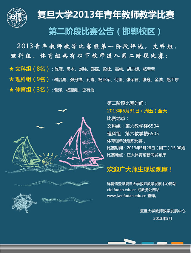 请以上进入第二阶段比赛的教师做好准备,比赛时间:2013年5月31日(周五),比赛地点:第六教学楼6504(文科组)、6505(理科组)。
