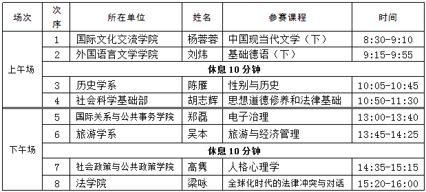 2013年青年教师教学比赛第二阶段定于2013年5月31日(周五)全体举行,具体时间:上午8:30开始,下午13:00开始。本次比赛每位参赛教师共40分钟:(1)自我介绍+课程介绍(5分钟);(2)现场授课(内容应是所提交教案的一部分)(20分钟);(3)接受评委点评(15分钟)。