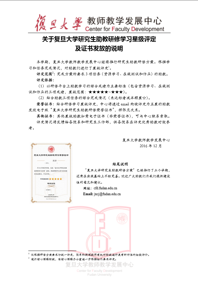 经公示后,中心将通过email为五星助教发放电子版研修荣誉证书。