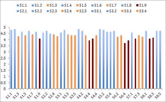 其中,被教师认为适用性程度较低的指标有S1.9、S4.4 、S4.5 、S6.4 、S6.5 、S7.2 、S8.2,涉及课程概况(学生自我介绍、网络礼仪)、课程技术(隐私保护)、课程教材(多样性、前沿性)、特殊服务(残障学生)等,一方面说明了中美在线教育发展程度的差距,但更体现出两国在教学理念、教学文化上的不同。因此,在新指标研制中,必须考虑到这些中国教学思想和文化的元素。