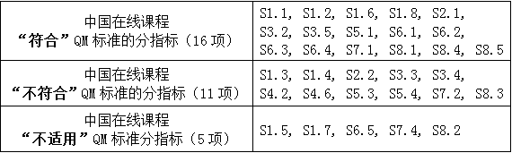 被评审的课程在16个QM分指标上获得课程评审员较多“符合”的评价(8个以上),说明我们的课程设计与这些QM标准比较一致;11个QM项目得到了较多的“不符合”评判(8个以上),这些标准可能是我们今后在线课程设计中亟待提高的地方;另有5个QM指标被认为“不适用”中国在线课程(6个以上),对这些标准需要我们进一步研究,以了解评审员判断“不适用”的依据及原因。