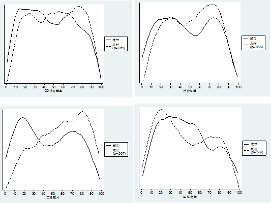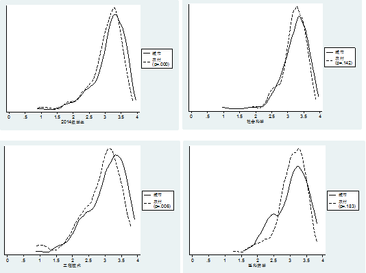 具体而言,农村学生的绩点分布位于城市学生左边(图1)、院系排名分布位于城市学生右边(图2)、挂科高于城市学生(图3)。也就是说,农村学生在三个指标上都弱于城市学生,并且有统计意义。分学科的分析表明,农村学生在工程技术学科中大一学业表现显著弱于城市学生,在社会科学和医药学科的院系内排名呈现了明显的两级分化的情况。