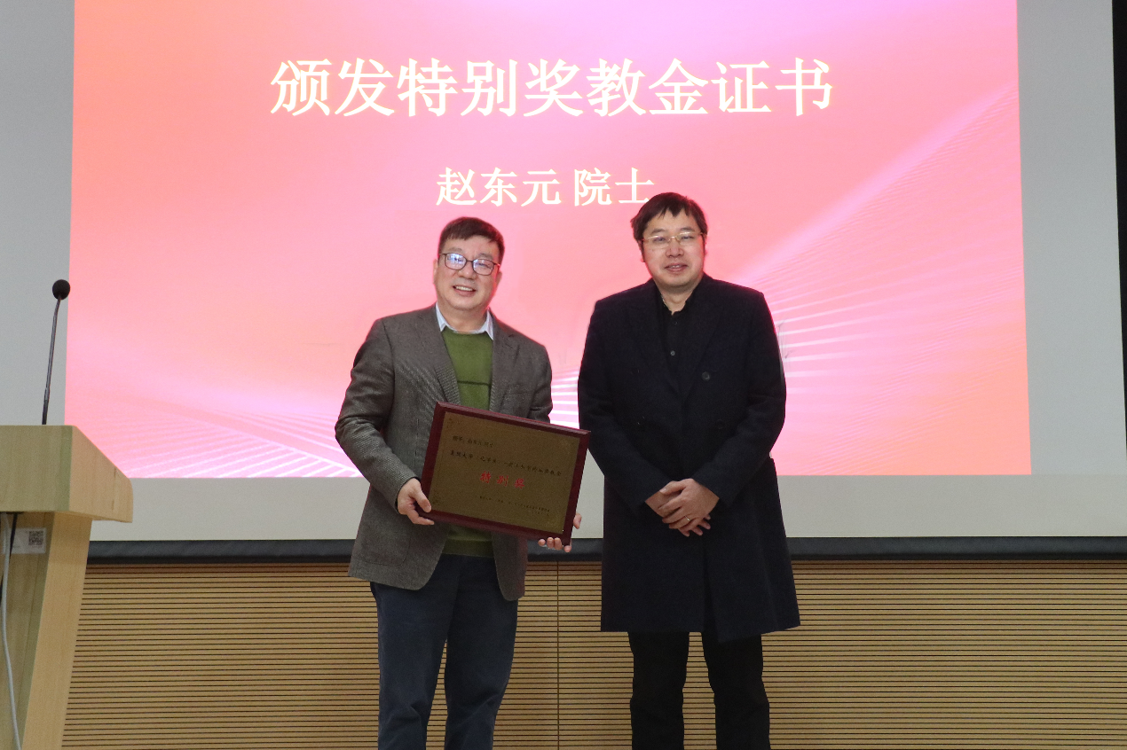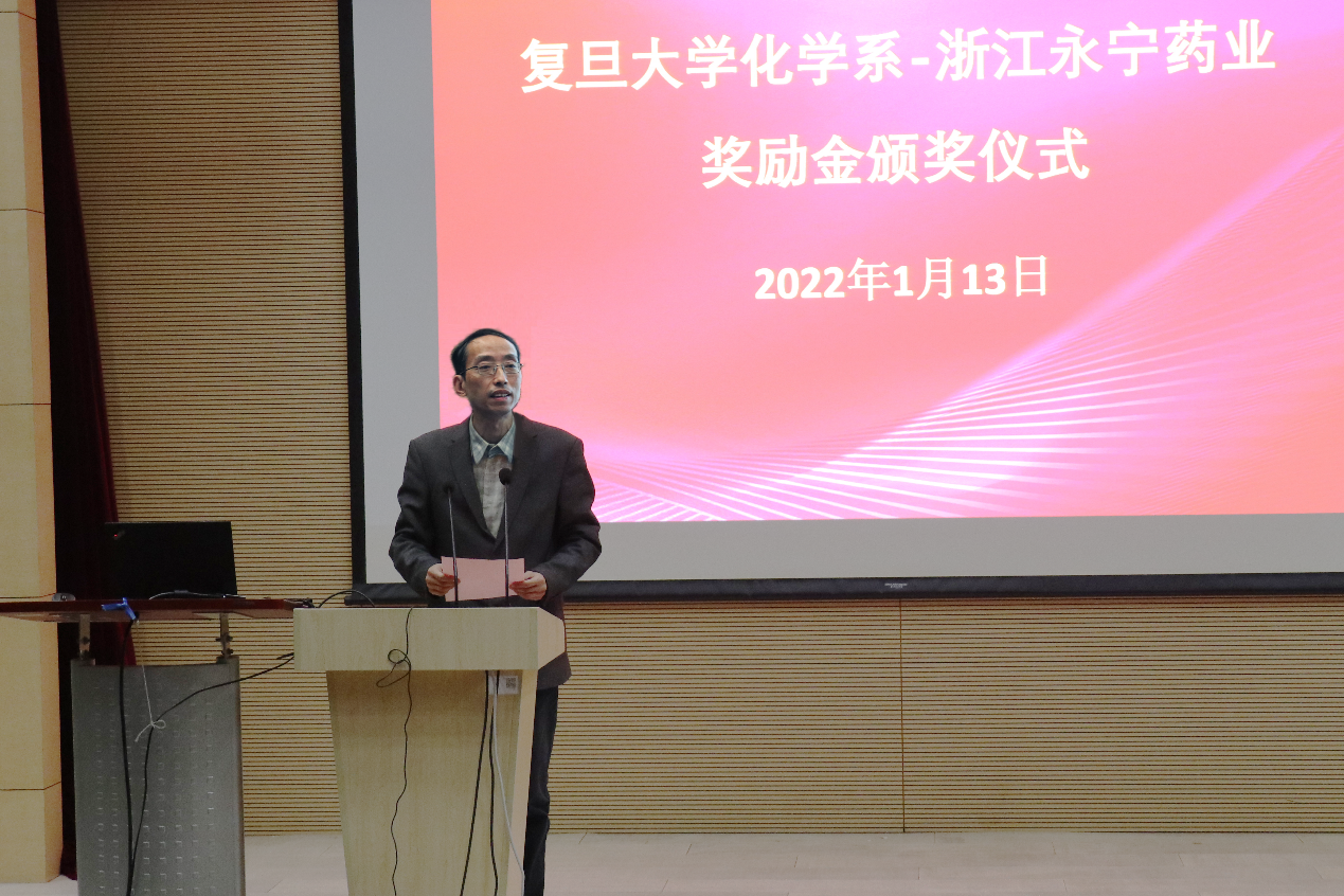 化学系主任周鸣飞教授宣读了2021年度浙江永宁药业奖励金获奖名单。赵东元院士及其团队的李伟、邓勇辉和张凡教授荣获“2021年度浙江永宁药业奖教金特别奖”;2017级直博生张慧、2019级硕士生刘鸿琨同学荣获“2021年度浙江永宁药业优秀奖学金”。