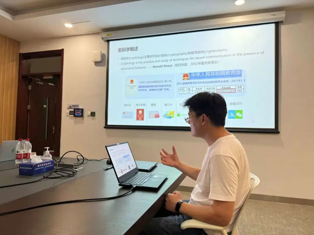 在网络空间安全组会议上,由钱振兴教授主持,李元副研究员、潘旭东副研究员,优秀博士生代表徐宛月、应祺超、赵旭阳分享。
