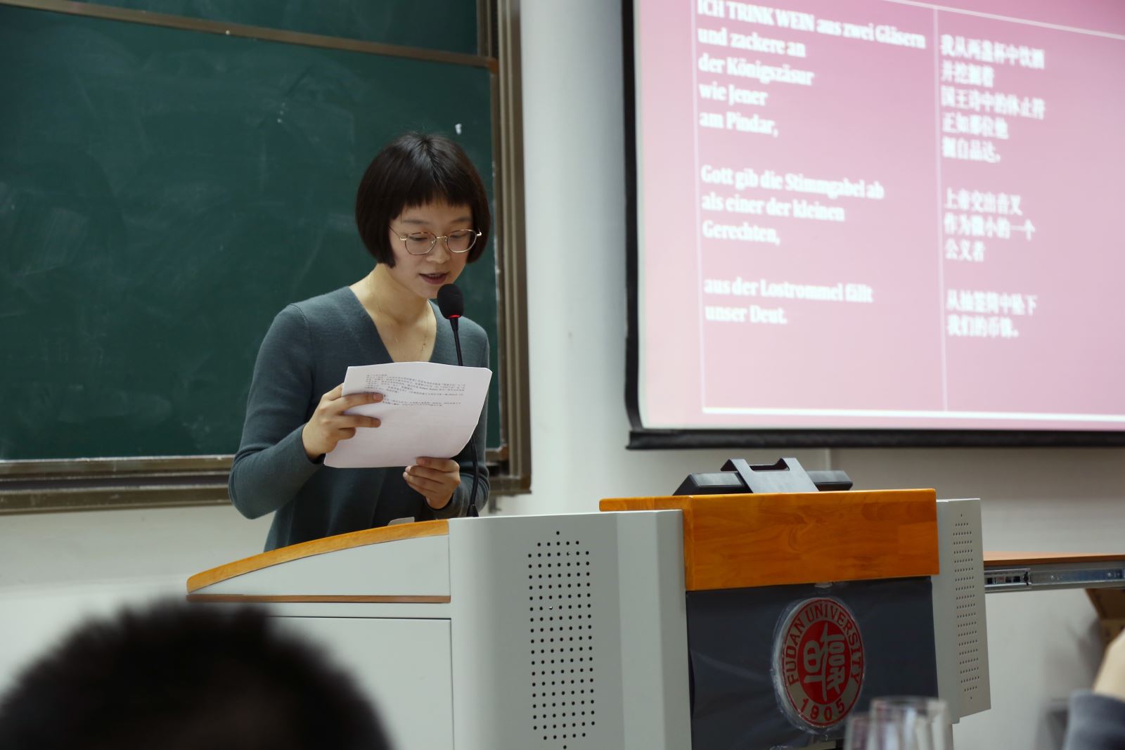 接着,姜林静老师分享了德语犹太诗人策兰的一首遗作《我从两盏杯中饮酒》,从“两盏杯”的德意志源泉与希伯来源泉切入,深挖了此诗的神学意象、历史矿脉和词源内涵。叶文先生为这首精神上“矿紫”的诗所配的葡萄酒是Gaglio, Terre Siciliane IGT Nero d’Avola 2015,并引导大家进行味觉区分和鉴别。许多同学当场表示,“就着诗歌”,自己第一次明显品尝出白葡萄酒和红葡萄酒的区别。