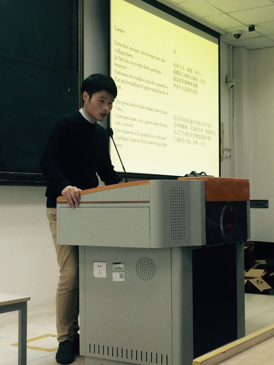 陈杰老师首先为大家解读了兰波的法文诗《泪》,经过陈老师的逐词细读和举一反三,同学们对这首并不典型的兰波诗作有了全新的理解。更多同学表示被陈老师的法语朗诵征服,“耳朵又要怀孕了。”叶文先生为这首诗配上了Moncaro, Verdicchio dei Castelli di Jesi DOCG Le Vele 2010这款白葡萄酒以对应兰波此诗中的“金色汁液”。