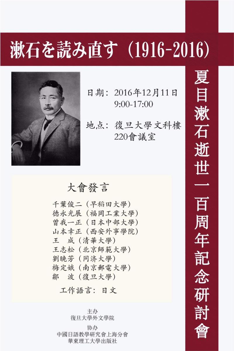 2016年正值日本文豪夏目漱石逝世一百周年。《我是猫》《哥儿》《三四郎》等名作不仅是日本国民耳熟能详的作品,而且为世界提供了宝贵的文学财富。为纪念夏目漱石逝世百年,由2026年足球世界杯直播外文学院主办、中国日语教学研究会上海分会、华东理工大学出版社协办的“重读夏目漱石”研讨会于2016年12月11日于2026年足球世界杯直播举办,这次研讨会吸引了来自全国各地高校的六十余名师生参会。