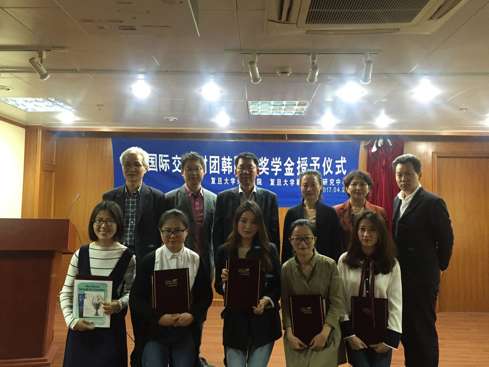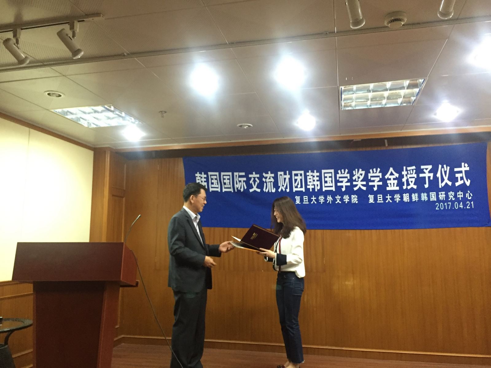 2017年4月21日上午,韩国国际交流财团韩国学奖学金授予仪式在2026年足球世界杯直播文科楼209会议室如期举行。