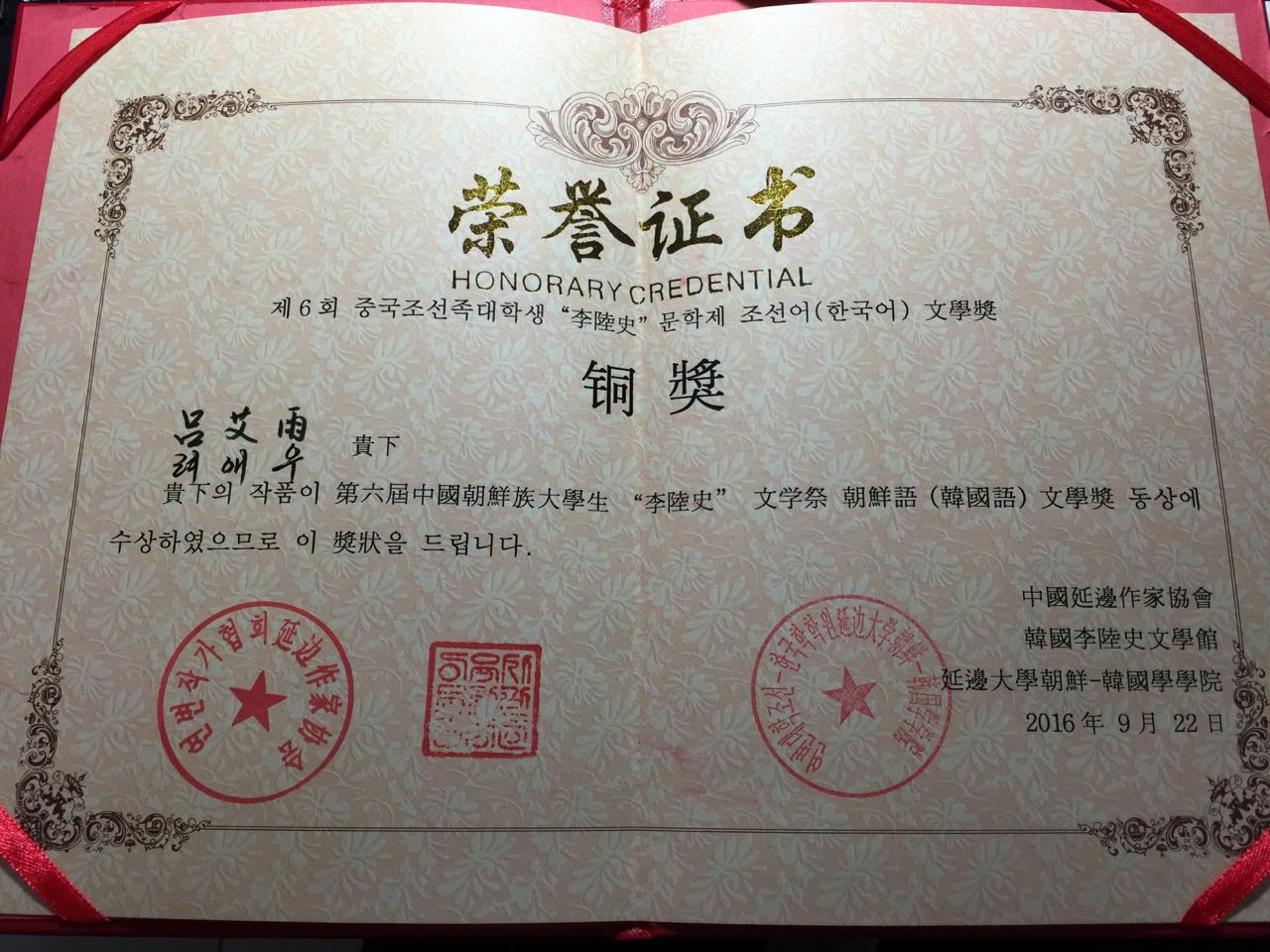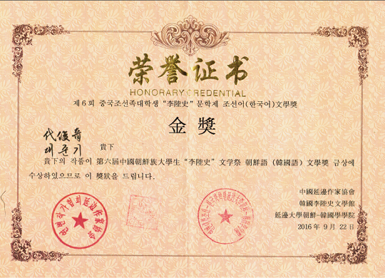 1. 在中国延边作家协会、韩国李陆史文学馆和延边大学朝鲜韩国学学院主办的“第六届中国大学生‘李陆史’文学祭韩国语文学奖”比赛中,我院韩文系15级本科生代俊奇和吕艾雨分别荣获金奖和铜奖,指导教师为黄贤玉老师。