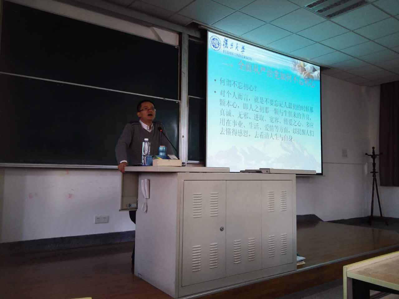 接下来,肖老师从个人及政党两个层面对“不忘初心”的具体内涵进行解读。他表示,对个人而言,就是不要忘记人最初的本心,即人之初与生俱来的善良博爱之心;对政党而言,就是不要忘记政党之根基和根本,不要忘记政党的性质、宗旨、旗帜、道路和方向。面对当前形势,肖老师结合习近平总书记建党95周年重要讲话,再次强调了八个“不忘初心,继续前进”的明确要求,并表示,“不忘初心”对政党而言,意味着永远保持奋斗精神和对人民的赤子之心,面对党内存在的问题,要及时自省和行动,时刻坚持马克思主义,牢记为共产主义、社会主义而奋斗的纲领。
