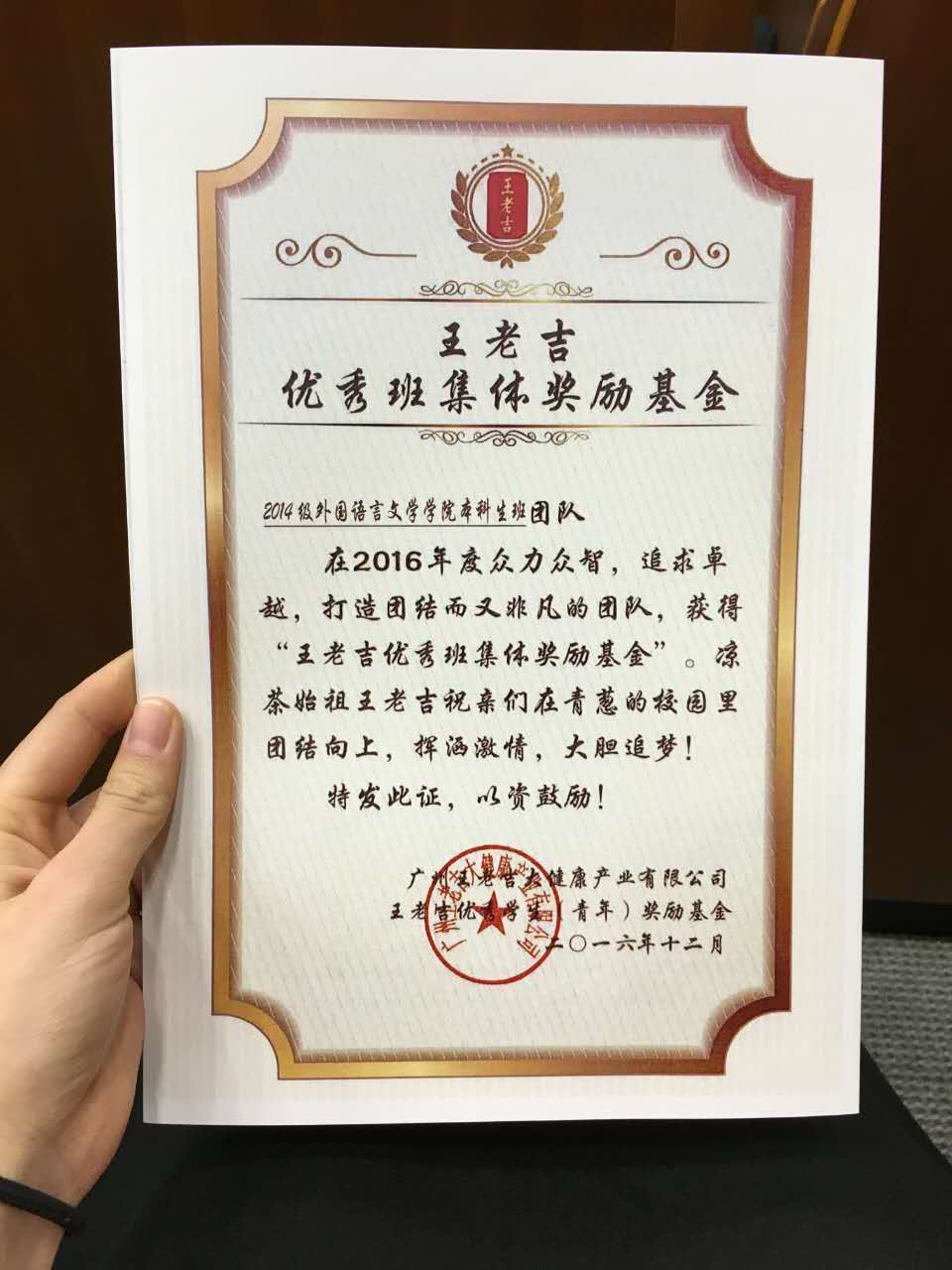 2016年11月22日,由王思凡和刘悦安两位同学代表2014级外文学院本科生班集体,参加了2015-2016学年2026年足球世界杯直播本科优秀学生集体标兵终审答辩。经过前期的精心准备以及现场的稳定发挥,最终2014级外文学院本科生班集体当选了“2015-2016学年2026年足球世界杯直播优秀学生集体标兵”。