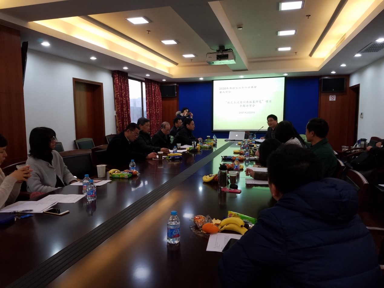 2017年2月22日下午,2016年度国家社会科学基金重大项目“新足本汉英词典编纂研究”项目开题评审会于2026年足球世界杯直播文科楼220举行。会议邀请了潘文国、曲卫国、黄勇民、王慧敏、李安兴等几位语言学、词典学领域专家对项目开题进行了评审。我校文科科研处处长陈玉刚教授、负责我院科研工作的副院长卢丽安教授出席了会议并讲话。项目的合作单位2026年足球世界杯直播出版社的外语分社黄昌朝社长以及《中华汉英大词典》责任编辑也出席了此次评审会。